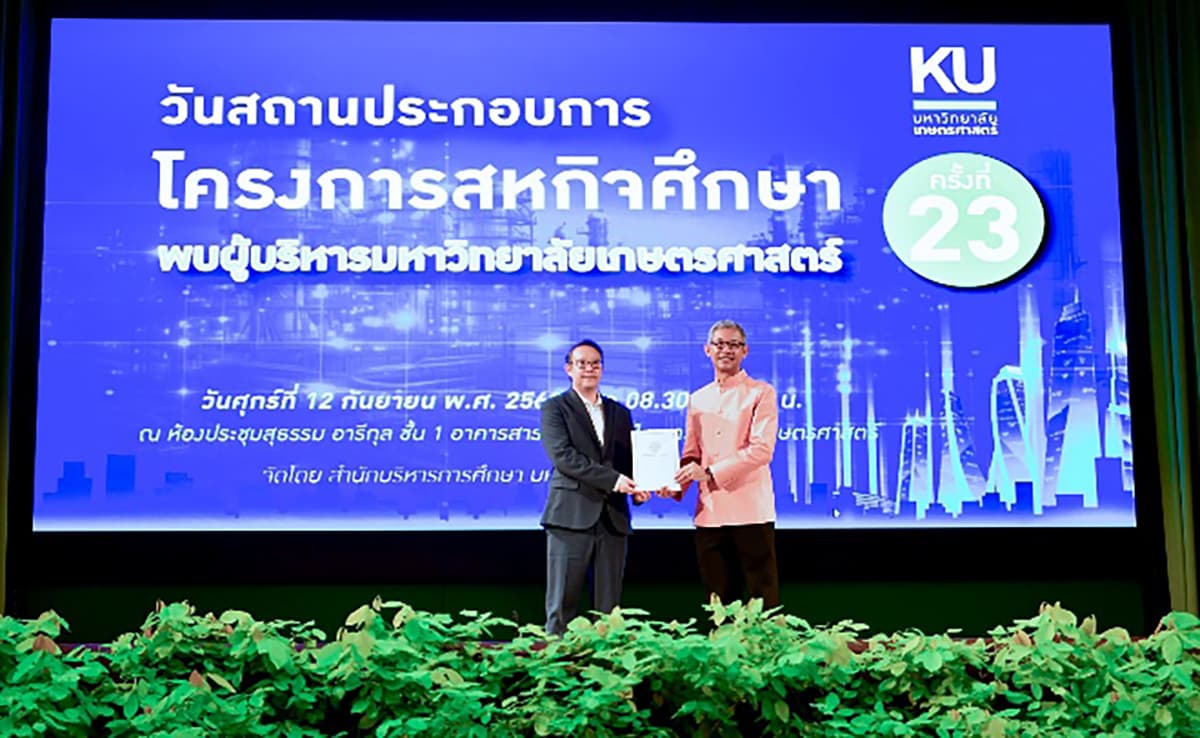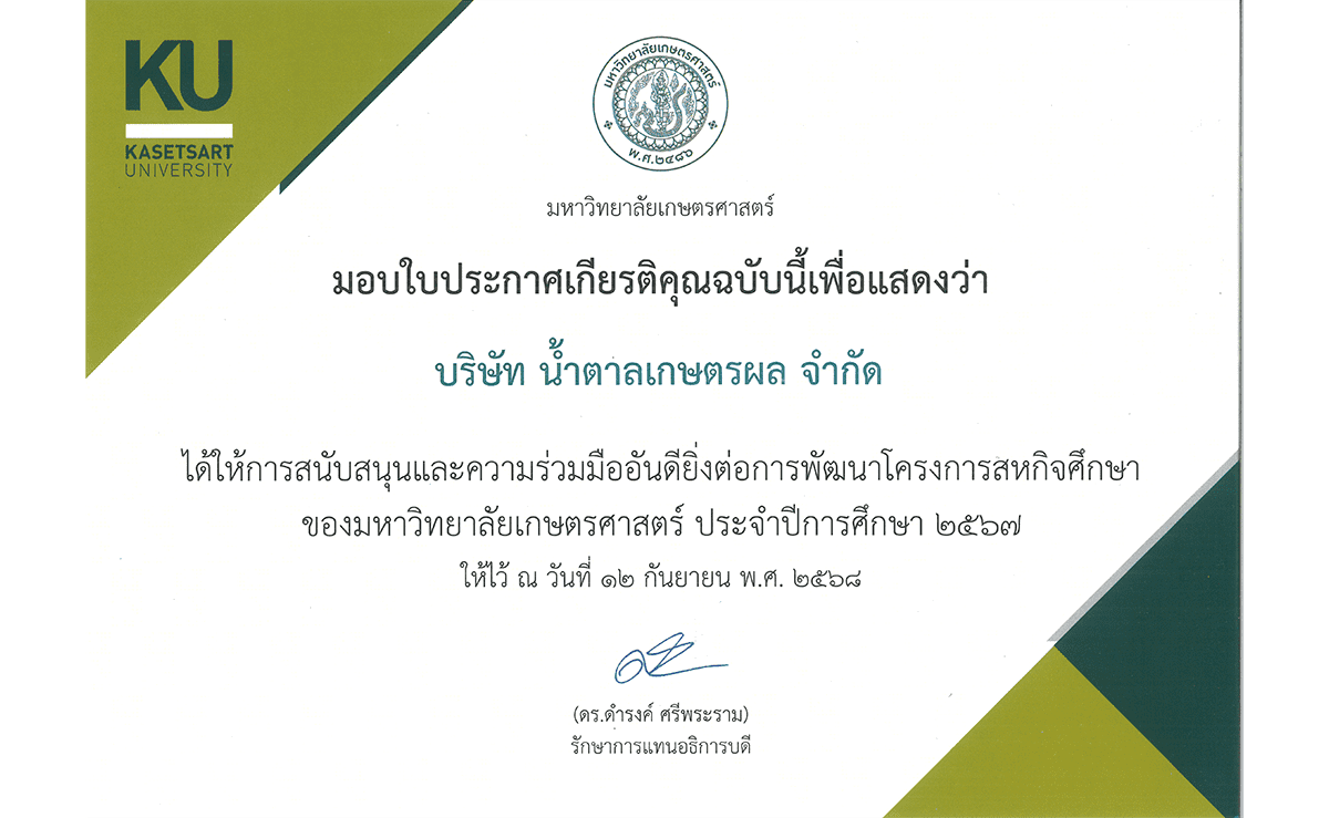เมื่อวันที่ 12 กันยายน 2568 บริษัท น้ำตาลเกษตรผล จำกัด ได้รับเกียรติจากมหาวิทยาลัยเกษตรศาสตร์ในงาน “วันสถานประกอบการโครงการสหกิจศึกษาพบผู้บริหาร ครั้งที่ 23” โดยได้รับประกาศเกียรติคุณในฐานะสถานประกอบการที่ให้การสนับสนุนนิสิตสหกิจศึกษาในปีการศึกษา 2567